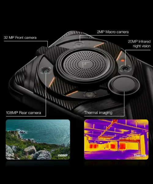 - Camera: 108MP main, 20MP night vision, 2MP macro, thermal camera, 32MP selfie camera.