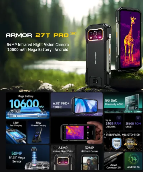 - Camera: 50MP wide, 64MP night vision, Thermal imaging, 32MP front